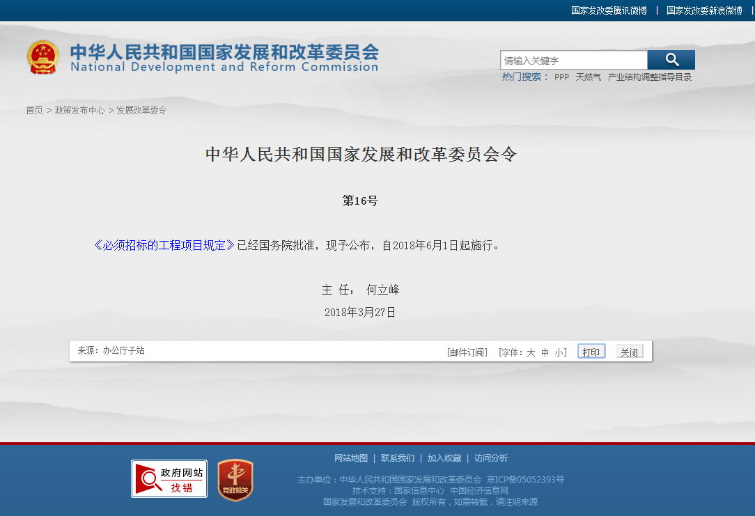 《必須招標的工程項目規(guī)定》已經國務院批準,現予公布,自2018年6月1日起施行。