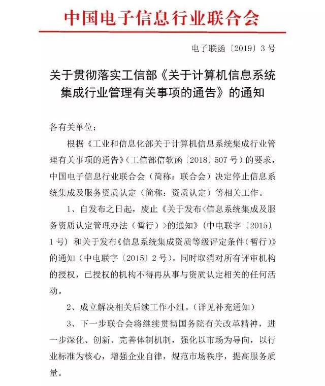 2014年3月,工信部發(fā)布《關(guān)于做好取消計算機信息系統(tǒng)集成企業(yè)資質(zhì)認(rèn)定等行政審批事項相關(guān)工作的通知》通知表明,該資質(zhì)認(rèn)定在取消行政審批后,認(rèn)定工作相移交給中國電子信息行業(yè)聯(lián)合會負(fù)責(zé)實施。