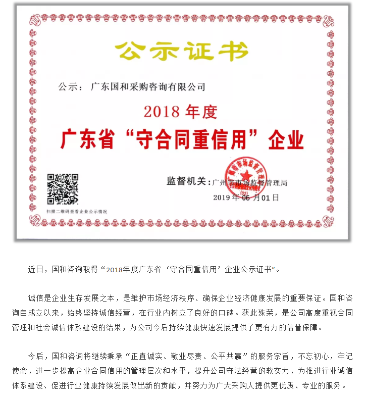 國和咨詢?nèi)〉谩?018年度廣東省‘守合同重信用’企業(yè)公示證書”